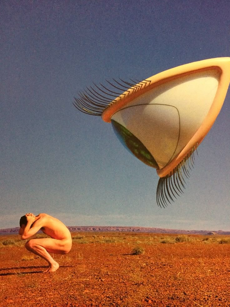 This piece captures the tension between vulnerability and exposure — a lone, naked figure cowers beneath the weight of a colossal, all-seeing eye suspended in the sky. The barren desert landscape intensifies the sense of isolation, while the surreal scale of the eye transforms it into both a guardian and a threat. It speaks to our fear of being truly seen, stripped of defenses, and the paradoxical longing for recognition. -
